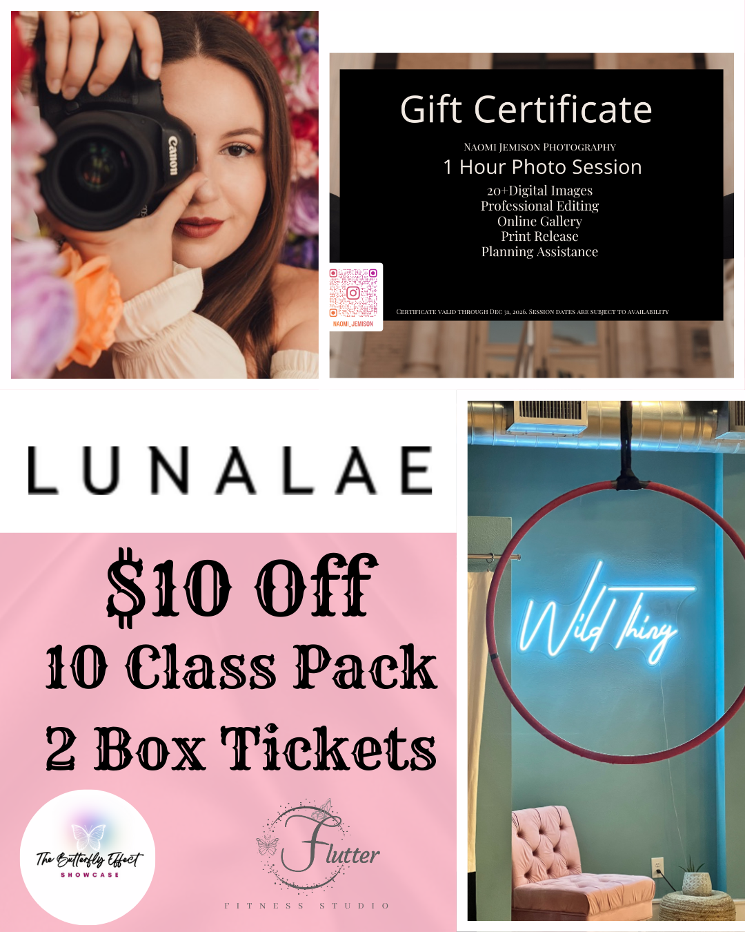 Includes 20+Digital Images, Professional Editing, Online Gallery & Print Release Planning Assistance.10 Aerial/Pole Classes to Flutter Fitness Studio